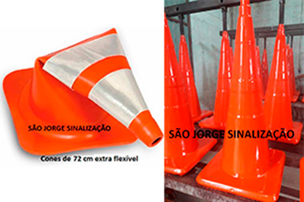 Cone de Sinalização de 50 e 75 cm, de alta resistência, confeccionado em Polipropileno, com rebaixo individual para encaixe das faixas.